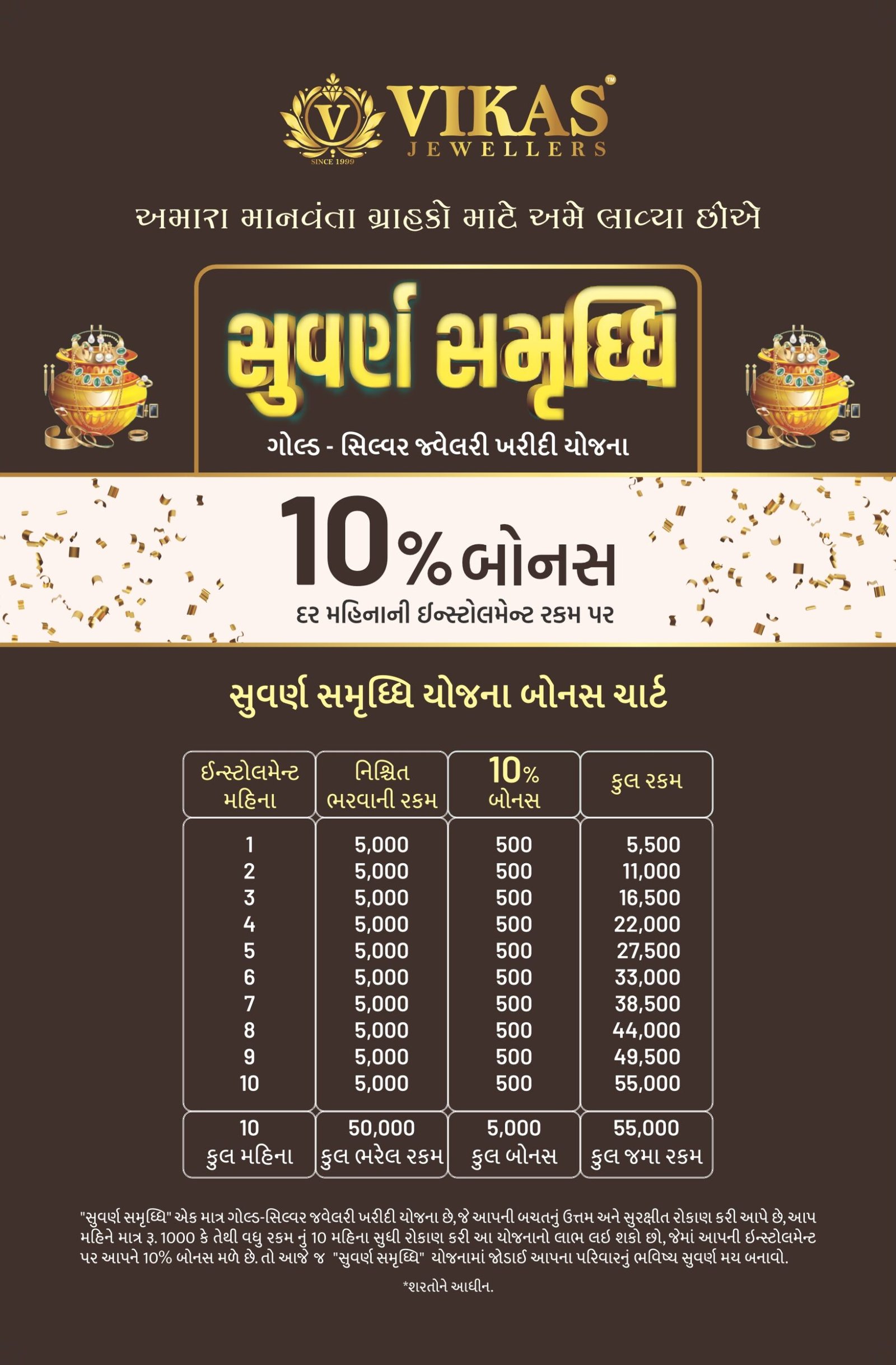 “Suvarna Samriddhi” is the only gold-silver jewelery purchase scheme, which provides excellent and safe investment of your savings, you only get Rs. 1000 or more by investing for 10 months and you can avail this scheme, in which you get 10% bonus on your installment. So make your family’s future golden by joining “Suvarna Samriddhi” scheme today.